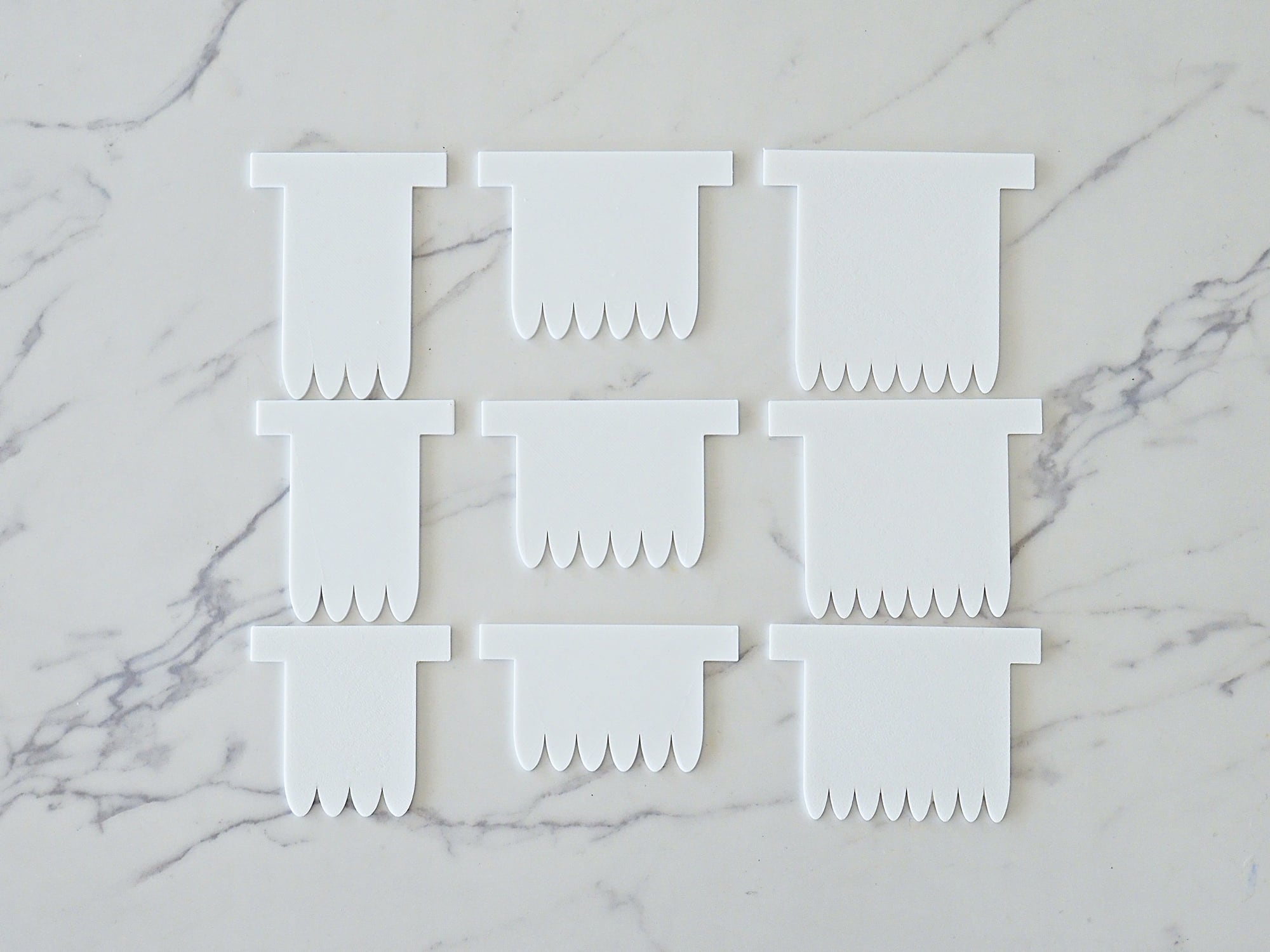 ゆるやかな優しい曲線が魅力のなみなみ模様のためのスクレーパーが登場です。 トール、カフェ、ミルクの3種類のモールドの幅に合わせ、 3種類の異なる長さのスクレーパーをセットにしました。 お好みの位置になみなみ模様を描いたり、 スクレーパーを組み合わせて複数のなみなみ模様を描いたり。 シンプルで、とても使いやすいスクレーパーです。